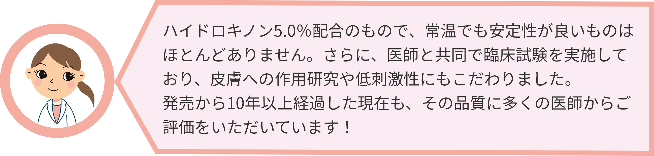 美白効果は知られているものの、取り扱いが難しいハイドロキノン*1について、どのように製品化するのか研究を重ねた結果、誕生したのがHQ ホワイトクリームです。 セプテム総研の製剤化技術により、不安定なハイドロキノンを製剤化することに成功し、製造後3年まで安定であることを確認しています。