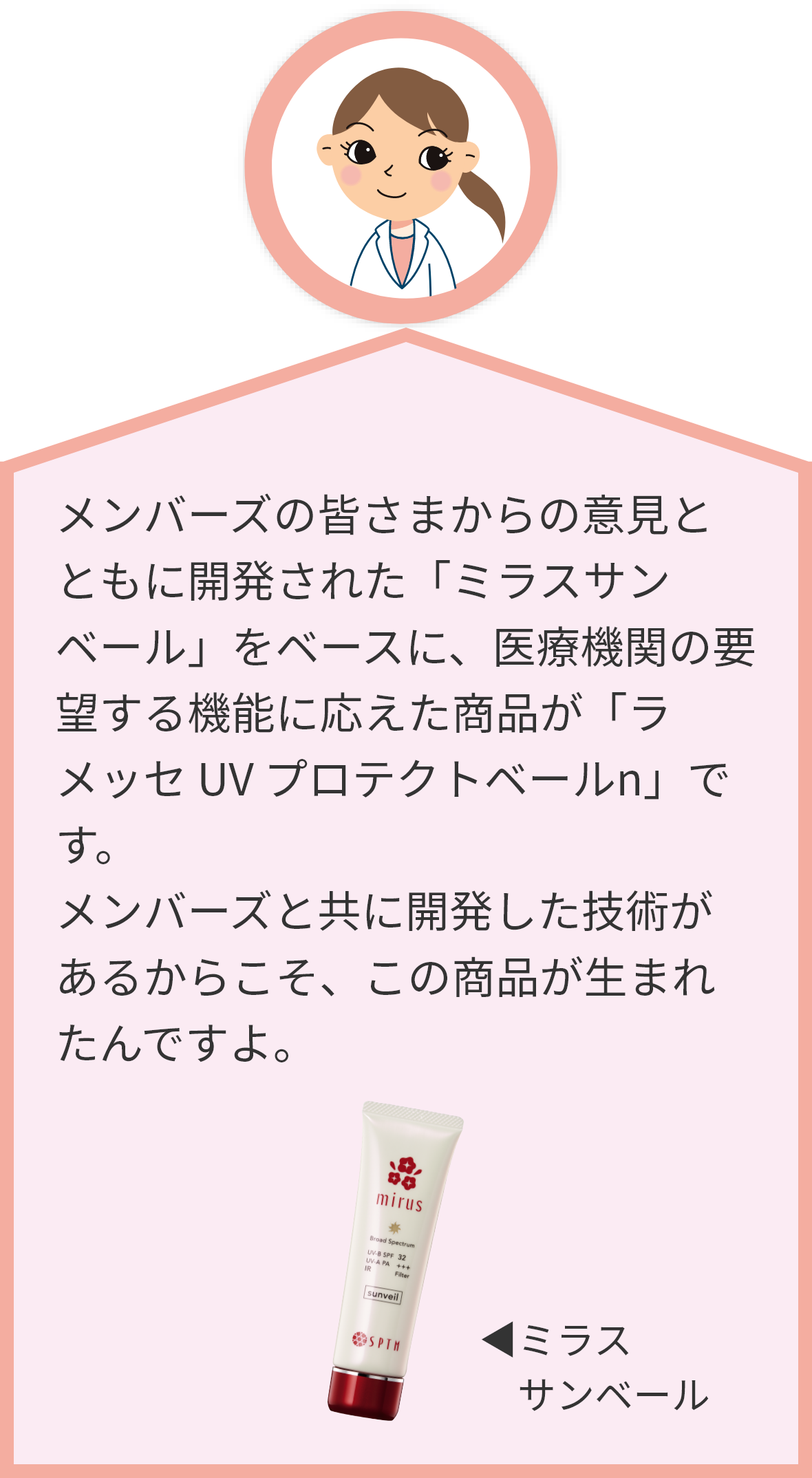施術後などのデリケートな肌をやさしいベールでしっかり守ることを目的とし、SPF50+ PA++++、ケミカルフリー(紫外線吸収剤不使用)で、敏感な肌の方や、お子さまも使用できる処方設計です。