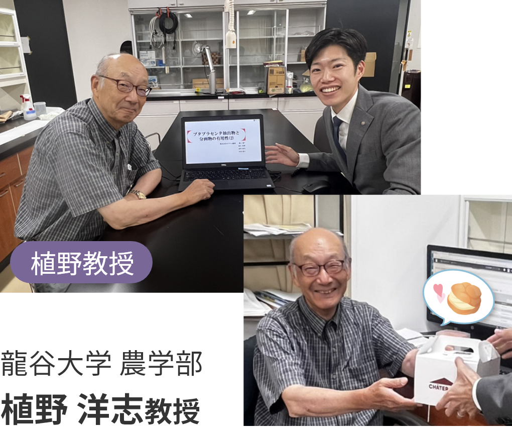 今回の学会発表で共同研究をおこなった植野教授へお礼のあいさつのため、滋賀県の龍谷大学へ行ってきました!龍谷大学農学部の教授であり、奈良女子大学の名誉教授でもある植野教授の日課は、昼食後のシュークリームタイム。 今回の訪問でも、もちろん持参しました!